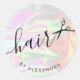 Diseño pegatina redondo de estilo peluquero con texturas holográficas de colores, tijeras y elegante fuente caligráfica.