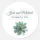 Elegante pegatina suculento, con suculentos botánicos verdes y morados sobre un fondo blanco. Las letras verdes pueden ser personalizadas con su propia información, perfecta para añadir un poco de algo especial a sus invitaciones bodas o favores matrimoniales.