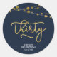 Este elegante pegatina redondo de 30 años presenta hilos de luces y la palabra "Treinta" en oro falso contra un fondo azul oscuro. Consulte otros elementos coincidentes aquí https://www.zazzle.com/collections/strings_of_lights_faux_gold_celebration_collection-119311942951401241?rf=238364477188679314 Personalícelo con sus detalles reemplazando el texto del marcador de posición. Para obtener más opciones, haga clic en el botón "Personalizar". *Tenga en cuenta que la marca de agua Zazzle que aparece en la vista previa del zoom NO aparecerá en el producto impreso final. © Rosewood y Citrus