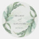 Selle su boda ahorrando las fechas o los sobres de invitación con estos pegatinas folclóricos tropicales - Los nombres de novios y novios y fecha boda rodeados de exóticas hojas pintadas a mano tropical. Esto forma parte de una colección de papel de boda con accesorios bodas a juego. Diseño creado para BarefootBride™ © por WhimsicalArtwork™