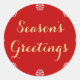 Elegante, personalizado, personalizado, navidad rojo, hermoso guión falso de oro / tipografía "Greetings Seasons", copos de nieve blancos, hoja clásica de pegatinas redondos. Un hermoso pegatina perfecto para tus navidades de correo esta temporada de vacaciones.