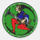 Decorar tus sobres, paquetes de regalo y más con IconDoEs una variación original en un clásico personaje de elfo Maxfield Parrish de los años 20 con Santa Claus Piernas de polka rojo y negro + pancho azul cobalto contra un rico fondo verde y rodeado de frase repetida "¡Feliz Navidad!". Elegir entre 2 tamaños