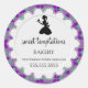 © 2021 Socialite Designs Inc. Esta caprichosa silueta dama, sosteniendo un quequito y con un fondo de patrón de cuarto, los pegatinas son un diseño maravilloso para usar como focas en el embalaje de la panadería.