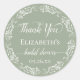 Estas hermosas pegatinas son perfectas para agradecer a los invitados en una fiesta de despedida de soltera. El diseño presenta texto de caligrafía con guiones en un fondo verde salvia con un borde de encaje floral blanco. El texto dice Gracias, con espacio para el nombre de la futura novia y la fecha.