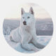 Pegatina Redonda Encantando Perro Husky Blanco en la nieve
