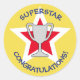 Este pegatina amarillo brillante tiene un texto que puedes editar para tus propias palabras de elogio. El valor por defecto en azul oscuro es "SUPERSTAR" y "FELICITACIONES". El diseño muestra un trofeo (esto podría ser por logros deportivos o académicos, por ejemplo) con una estrella roja y blanca detrás.