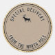 Una entrega especial del pegatina de la etiqueta del Polo Norte para etiquetar tus regalos con un tipo de letra nevada con escritura roja y verde contra un fondo marrón kraft.