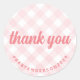 Esta ducha de bebé gracias a tu pegatina tiene un fondo de gingham rosa pastel y blanco, que evoca una sensación de encanto del sur. El mensaje "gracias" en elegantes letras cursivas asegura que el pegatina de agradecimiento atrae la atención mientras mantiene un aire de elegancia informal. El pegatina de agradecimiento refleja un estilo preppy clásico pero contemporáneo, adecuado para celebrar a la futura madre con un diseño atemporal.
