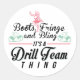 Boots, Fringe y Bling — ¡es cosa de Drill Team! Si no lo entiendes, probablemente no seas de Texas :) Un chica de color coral con un uniforme clásico del equipo de perforación posa en la parte superior del diseño declarando Boot, Fringe y Bling con un tipo de letra de escritura negra. Alrededor de las palabras 'y bling' hay un par de poms de color menta, con un gorra y una funda guardapolvo. Las líneas de coral separan la parte superior e inferior del diseño. En la parte inferior del diseño se muestra una cosa del equipo de taladros en negro con sombra de menta en la palabra Equipo de taladros. Un diseño lindo y divertido para todos los miembros de tu equipo de perforadores!