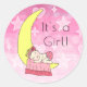 Es una niña, fiesta de bebé o anuncio de nacimiento adhesivo redondo clásico para sellar invitaciones o anuncios de nacimiento. Dulce bebé caucásica durmiendo en la luna con fondo rosa estrella.