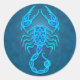 Este símbolo estilizado para el signo zodiaco de Escorpio está decorado con líneas intrincadas y patrones de puntos. El elaborado diseño presenta un escorpión agresivo con sus pinzas que alcanzan hacia arriba y la cola que fluye por debajo. Este impresionante pegatina azul es una forma bonita y elegante de mostrar tu signo astrológico.