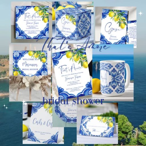 Eso son los azulejos de Amore Blue Maiolica limones vintage ducha de novia italiana personalizada monograma impreso a favor de pegatinas plantilla, con temática mediterránea ducha de novia cítricos de ducha de novia favores