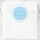El nombre del niño está en el centro, con grupos de tres copos de nieve blancos encima y debajo, todo en un círculo azul bebé. Hay texto arqueado azul alrededor, en un círculo blanco. Encima dice "Entrega especial de Santa Claus" y debajo, "Expreso del Polo Norte".