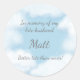 Esta pegatina de humor mórbido tiene una escena de cielo azul celestial, nubes soñadoras, estrellas brillantes y las palabras "En memoria de mi difunto esposo [insertar nombre] Mejor tarde que nunca!" Perfecto para aquellos que esperaron mucho tiempo por una pareja.