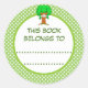 Puntos de polka verdes y blancos. "Este libro pertenece a" texto. Árbol verde en la parte superior de una etiqueta blanca con un borde verde.