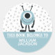 "Este libro pertenece a" pegatina que presenta un monstruo personalizado azul pastel adorable con un ojo grande, una gran sonrisa y antenas negras.