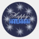 Este hermoso diseño pegatina presenta ocho brillantes Estrellas de David en un arreglo alrededor del texto 'Happy Hanukkah'. El fondo es el azul de medianoche rodeado de estrellas blancas brillantes.
