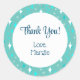 Pegatinas editables de agradecimiento con guion y letras de serif en un patrón retro de estrella verde azulada y blanca sobre fondo verde azulado claro.