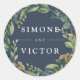 Selle sus sobres de invitación o sus favores con estos elegantes stickers botánicos de boda con sus nombres en blanco, enmarcados por una corona de color agua de eucalipto verde, hojas y diminutos brotes azul marino sobre un fondo azul humeante. Coordina con nuestra colección de bodas Eucalyptus Grove.