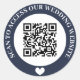 Boda sitio web QR pegatina de código en azul marino y blanco con texto curvo y corazón blanco. Pegatina de código QR de boda blanco y negro.