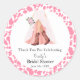 ¡Elegantes pegatinas de agradecimiento por celebrar! Con una novia moderna en un vestido de novia elegante, mostrando juguetonamente sus botas de vaquero mientras sostiene un ramo de rosas e hidrangeas, estas pegatinas son la mezcla perfecta de elegancia y estilo country. El fondo muestra una elegante impresión de vaca rosa.