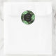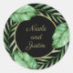 Este bonito pegatina tropical redondo botánico en negro y verde presenta un anillo de palmeras y hojas de plátano que rodean el texto deseado. El ejemplo que se muestra aquí muestra los nombres de una novia y un novio. Personalice con los nombres que desee u otro texto. Estos pegatinas están disponibles en dos tamaños. El tamaño reducido es una buena elección para los sellos para sobres o para los pequeños favores y regalos. El pegatina más grande hace una buena etiqueta de fiesta a favor, para usar en regalos más grandes, o para usar en otros artículos.
