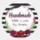 ¡Este pegatina es una etiqueta para los elementos hechos a mano! Póngalo directamente sobre el elemento o cree su propia etiqueta redonda con esta pegada en el frente para darle un aspecto elegante. Simplemente cambie el nombre existente por el suyo propio. El diseño presenta rosas florales de acuarela, hojas y plumas sobre un fondo rayado blanco y negro.