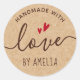 pegatinas redondos con corazones rojos y el texto "hecho a mano con amor" y su nombre personalizado en un papel Kraft impreso se ven de fondo. La palabra "amor" está escrita en una elegante fuente de escritura caligráfica. Utilícese como sellos para sobres, pegatinas para regalos y favores, embalaje de productos, etc. Síguenos en Facebook: @business estacionery para más productos, noticias, ventas y más.