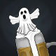 Fantasma de Halloween sobre una taza llena de cerveza con espuma encima.