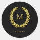 Pegatina Redonda Faux Gold Laurel Wreath sobre negro con monograma