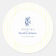 Pegatinas de favor de boda redondas azules y amarillas inspiradas en Italia con limones garabateados a mano en azul marino y rayas amarillas. Personalice con nombre y fecha del evento.