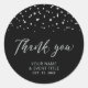 Esta moderna etiqueta de agradecimiento personalizada añadirá un detalle elegante a tu día especial. Este diseño presenta letras plateadas " Gracias " y confeti hexagonal en un fondo negro. Invitaciones y papelería para fiestas de cumpleaños a juego están disponibles en mi tienda BaraBomDesign.