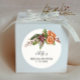 Pegatina de favor con tema navideño rústico con ilustración de acuarela de botánicos invernales, incluyendo muérdago, rama de pino, bayas, naranja, etc.
