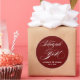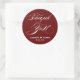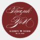 Rojo Gracias Boda Favor Pegatina Redondo Clásico. Elegante caligrafía blanca y violeta gracias a los pegatinas son perfectos para un simple boda rojo marrón y blanco. Personalice las etiquetas del pegatina con sus nombres y la fecha. Estos pegatinas pueden ser utilizados para una boda, una ducha de novia o cualquier otro evento organizado por la pareja.