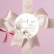 Pegatinas para tus favores en un diseño boho de palmas secas con orquídeas frescas de color rosa. Un círculo encierra la caligrafía 'gracias' y tu nombre/evento y fecha personalizados. Neutros con un toque rosa pálido.