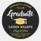 Agregue un toque personalizado y elegante a las invitaciones, anuncios y favores de fiesta de graduación de la universidad o la escuela secundaria con elegantes pegatinas redondas personalizadas en negro, dorado y blanco. Todo el texto de esta plantilla es fácil de personalizar para sellos de sobre o etiquetas de agradecimiento. El diseño moderno presenta un gorro de graduación, caligrafía de estilo y tipografía clásica vintage. Tenga en cuenta que el dorado se imprime en color amarillo, no en lámina metálica. Estas pegatinas añaden un toque final único a una celebración de graduación. ¡Felicitaciones al graduado!