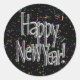 Pegatina Redonda Feliz Año Nuevo - Texto Plateado con Confetti Negr