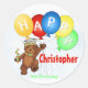 Un juguetón oso de peluche real con una corona principesca de joyas azules, amarillas, rojas y verdes con una colorida variedad de globos es un pegatina redondo feliz cuarto cumpleaños. Personalizar al pegatina con el nombre del niño de cumpleaños lo hace especial. El nombre y el año se pueden personalizar utilizando la plantilla proporcionada.