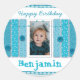 Haz que ese cumpleaños sea extra especial con esta divertida pegatina redonda con un diseño de scrapbooking azul. Agrega el nombre del niño y una foto para un regalo personalizado. Combina con la cinta, etiqueta y bolsa de regalo a juego.