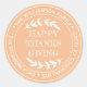 Pegatina redonda de Feliz Día de Acción de Gracias con dirección de devolución con tu nombre y dirección en tipografía blanca con estilo que presenta el texto FELIZ DÍA DE ACCIÓN DE GRACIAS en tipografía manuscrita con un toque elegante de follaje rústico en un fondo de naranja calabaza. Simplemente agrega tu nombre y dirección. Diseñado exclusivamente para ti por Happy Dolphin Studio. Si necesitas ayuda o productos coincidentes, por favor contáctanos a través del chat de nuestra tienda. ¡Feliz Día de Acción de Gracias!