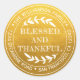 Pegatina redonda de dirección de devolución para el Día de Acción de Gracias con tu nombre y dirección en tipografía blanca con estilo que presenta el texto BENDITO Y AGRADECIDO en tipografía manuscrita con un toque elegante de follaje rústico sobre un fondo dorado clásico. Simplemente añade tu nombre y dirección. Diseñado exclusivamente para ti por Happy Dolphin Studio. Si necesitas ayuda o productos que coincidan, por favor contáctanos a través del chat de nuestra tienda. ¡Feliz Día de Acción de Gracias!