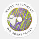 Ilustracion pintado de un espeluznante donut dulce con esbelta helada verde y púrpura y fantasma! Personalizar el texto en el pegatina para enviar regalos y saludos de Halloween a amigos y familiares o usa para agradecerte bolsos de favores en tu próximo fiesta temático de Halloween.