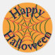 Un sticker de Feliz Halloween con un fondo de telaraña. Ideal para usar como sellos de sobres, regalos o en tarjetas.