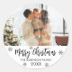 Escritura moderna en blanco y negro caligrafía de "Feliz Navidad" Navidades de fotografía familiares Pegatina de vacaciones. Cuenta con bonitos copos de nieve (nevado), nombre familiar y año. Excelente para Sellos para sobres de accesorios de correo y Pegatinas de regalo.