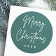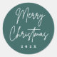 Feliz pegatina navideño con el texto "Feliz Navidad" escrito a mano en un guion escrito a mano sobre un fondo verde pino con el año o texto personalizado debajo.