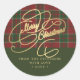 Pegatina Redonda Feliz Navidad guión dorado cuadros rojos y verdes