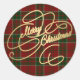 Pegatina Redonda Feliz Navidad guion dorado cuadros tartán rojos y
