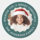 Ronda, pegatinas de pino verde con texto de personalizable "Te deseo una feliz Navidad" y tu nombre alrededor de tu foto dentro de un borde ondulado.