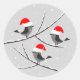 Este Pegatina redondo clásico Navidades adorables presenta el ilustracion de tres pájaros sentados en las ramas del árbol cubiertas de nieve. Los pájaros llevan sombreros de Santa Cruz y disfrutan de una suave nevada. El ilustracion se realiza en tonos grises restringidos para destacar la alegría del color rojo intenso de los gorras.