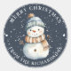 Pegatina Redonda Feliz Navidad Snowman con Gorra en azul